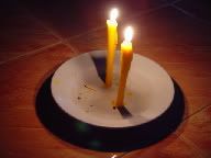 It's the lonliest sight in the world--two candles with minimal outside light. Everyone is gathered around our lights as the rain continues to pour.